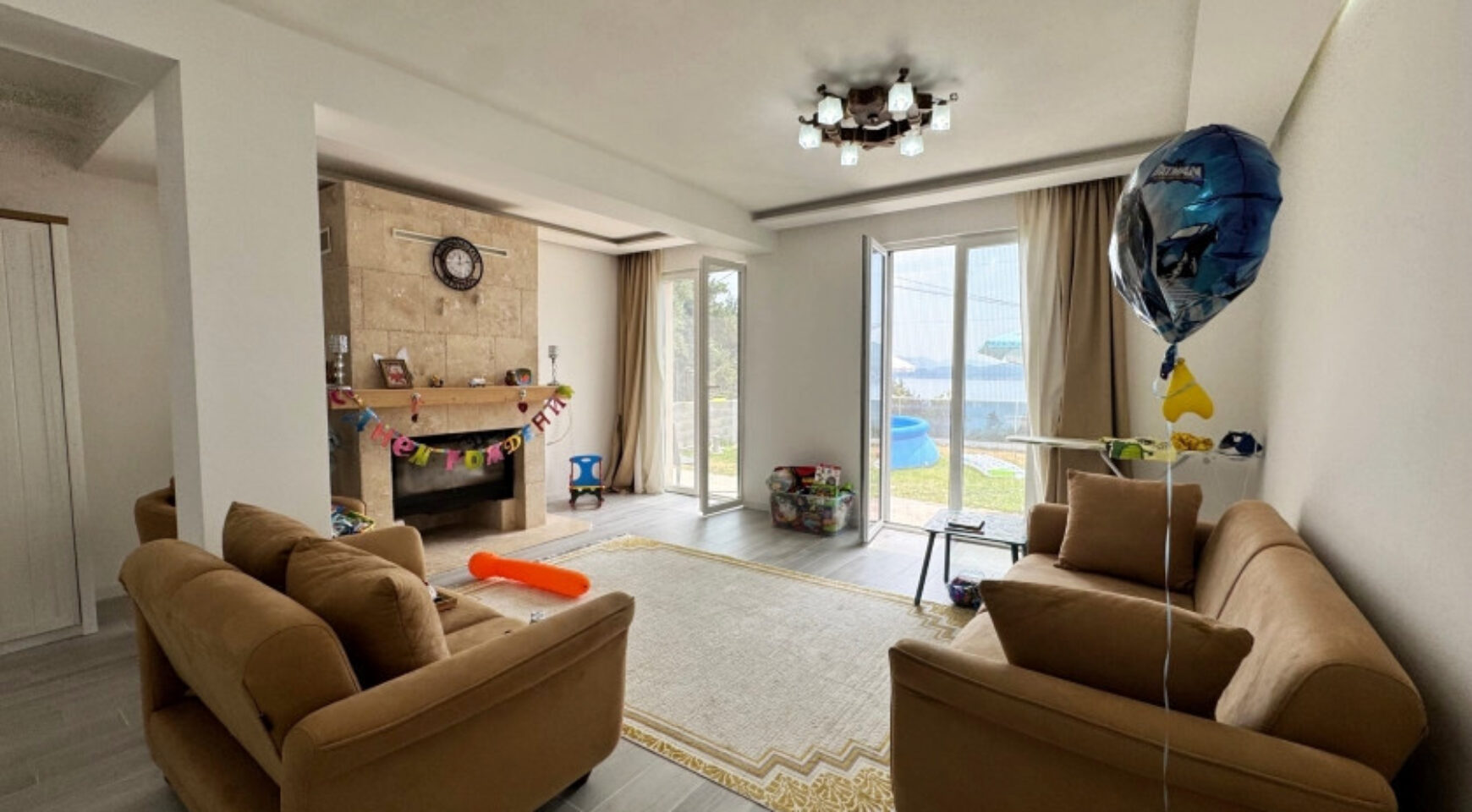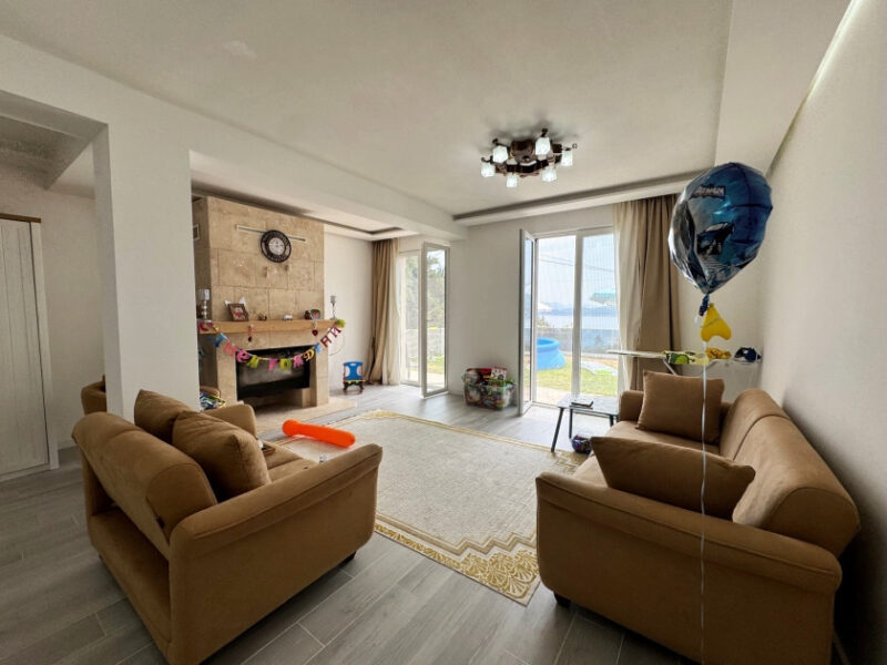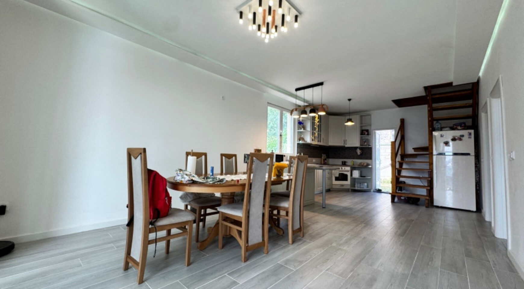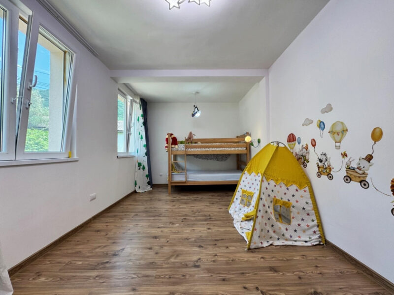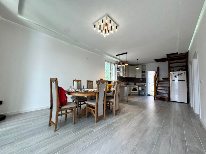 The ground floor is fully finished and consists of a large living room, one bedroom, and a combined kitchen and dining room. The second floor has three bedrooms and a bathroom.