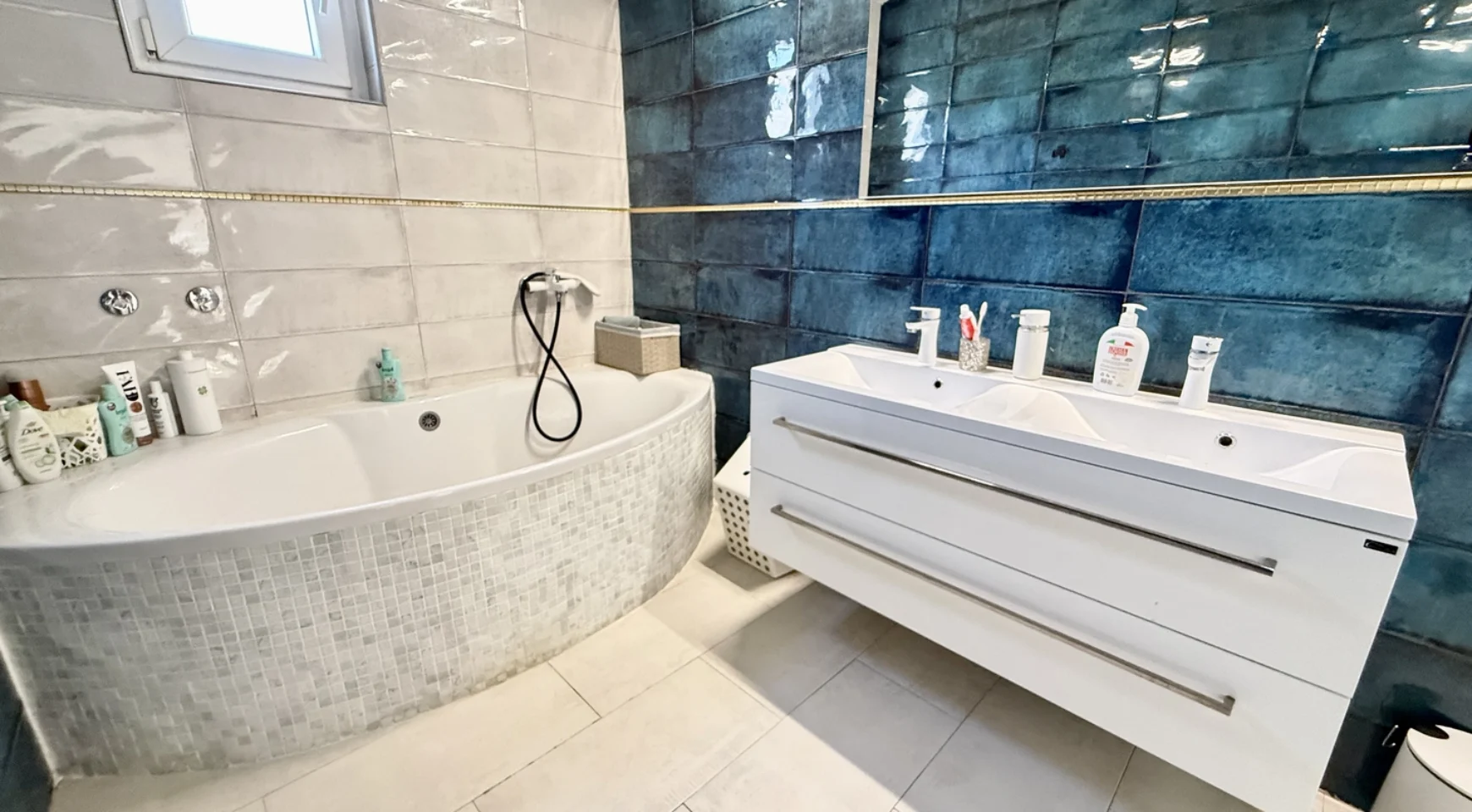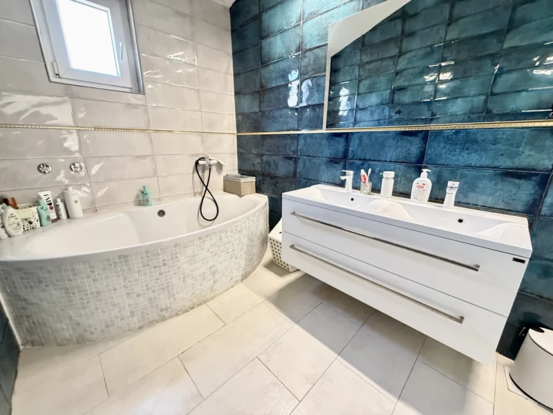 The house’s layout is focused on comfortable living. The spacious and bright living room serves as the central area of the house, unifying the space and creating a cozy atmosphere. The house features two bedrooms and two bathrooms, one of which is equipped with a jacuzzi. A terrace expands the living space and allows for enjoying the surrounding scenery.