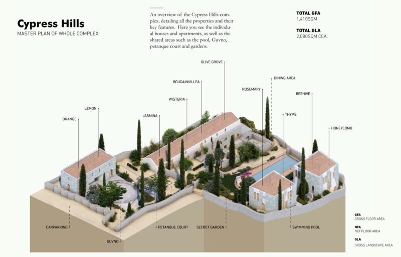 Для кого предназначен наш проект? Для тех, кто ищет волшебный дом для отдыха или выхода на пенсию, надежную инвестицию и тихое место вдали от популярных туристических троп? Тогда мы предлагаем вам Cypress Hills — волшебное место для отдыха. В прошлом эти поместья принадлежали процветающему фермерскому сообществу, и оливки с окрестных полей перемалывались в насыщенное, ароматное оливковое масло на нашей мельнице. Мы уважаем и бережно храним эту историю и сохранили многие ключевые черты старины, привнося в различные объекты недвижимости атмосферу современности, простора и роскоши. Всё — от дизайна, функциональности и экологичности до комфорта, покоя и очаровательных личных штрихов — сыграло важную роль в создании Cypress Hills.