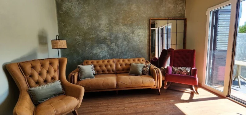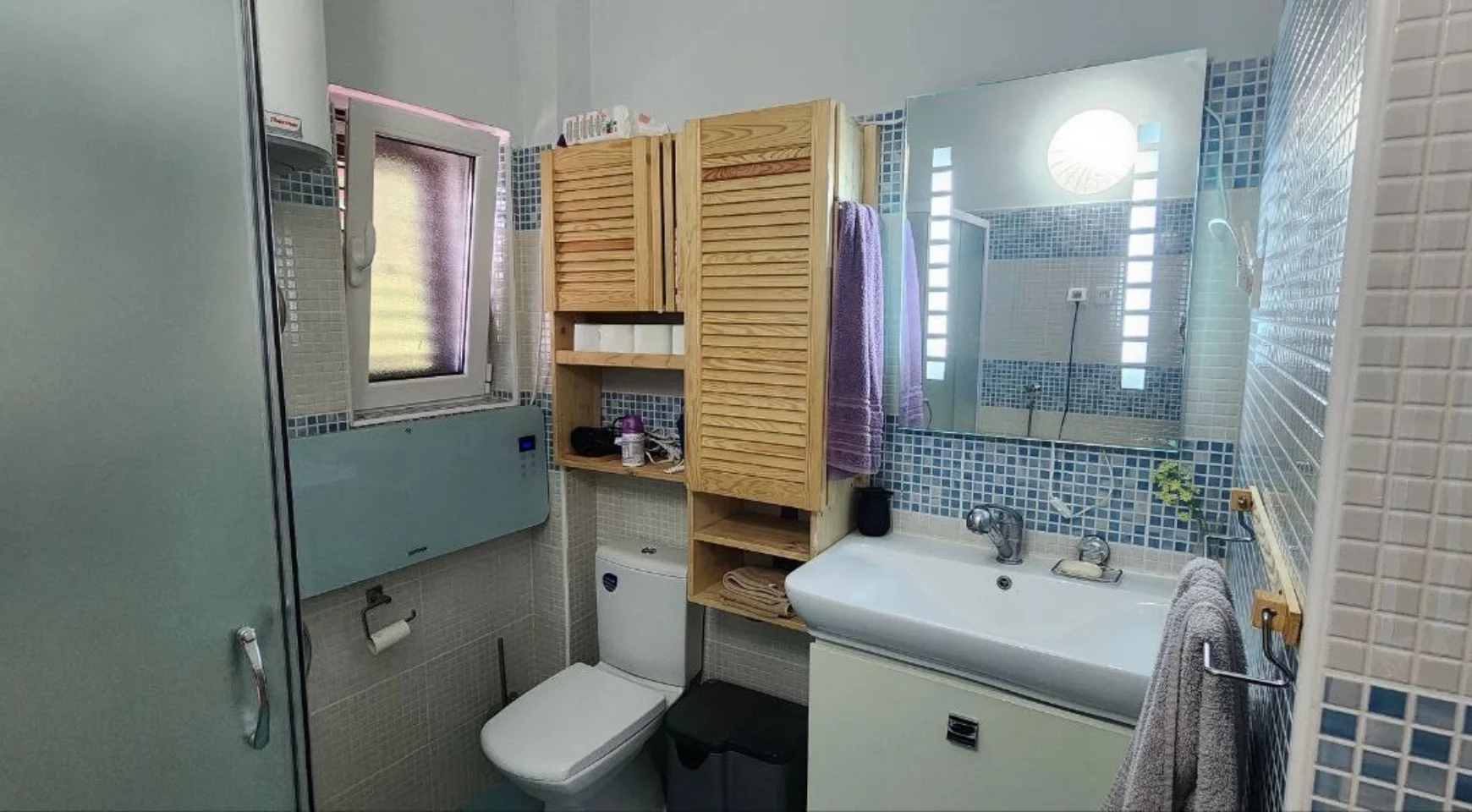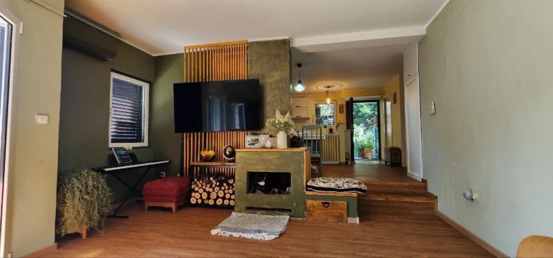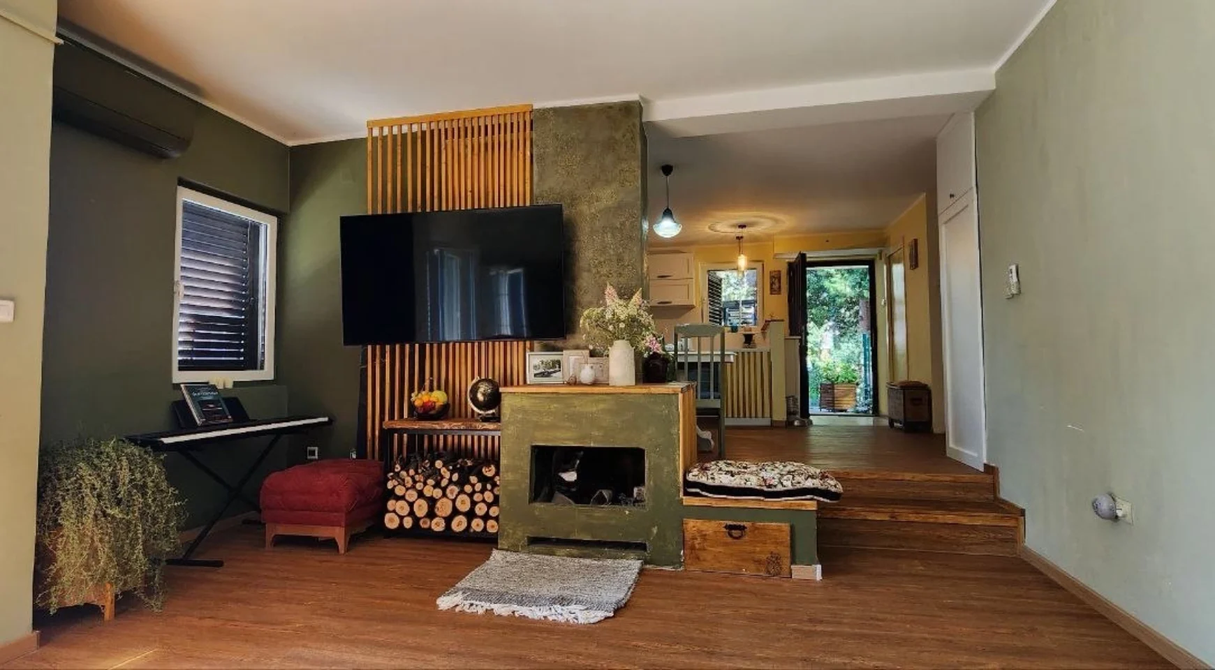 На первом этаже расположена просторная гостиная с современной кухней, оснащенной системой фильтрации воды (обратный осмос). Уют добавляет действующий камин — редкий и ценный элемент для подобной недвижимости. Также на этом уровне находятся ванная комната, встроенные системы хранения и две террасы.