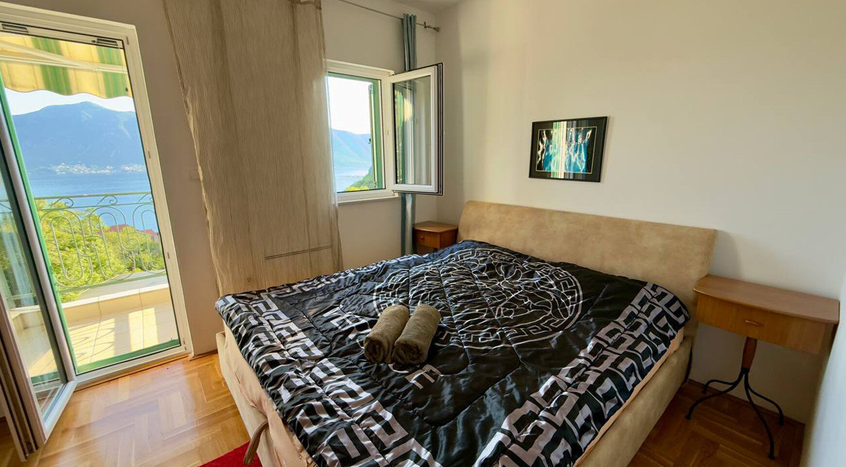 Квартира состоит из двух спален, гостиной с кухней и обеденной зоной, ванной комнаты и террасы. С террасы открывается потрясающий вид на Которский залив.