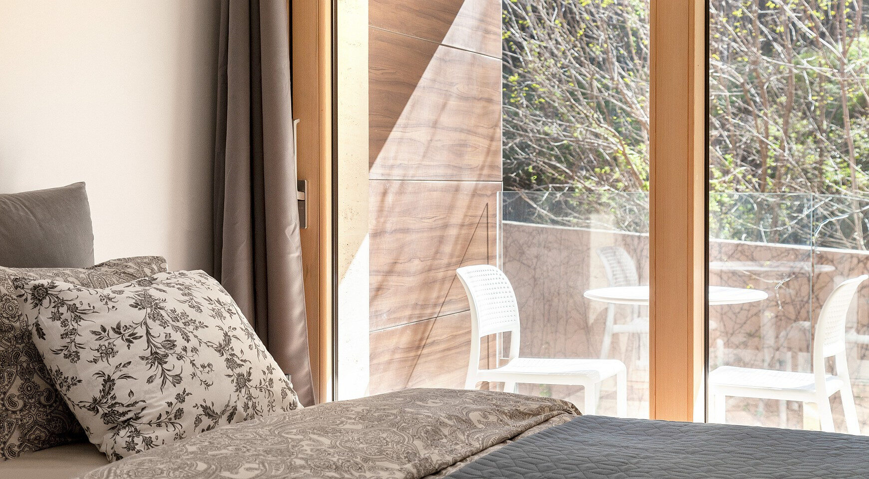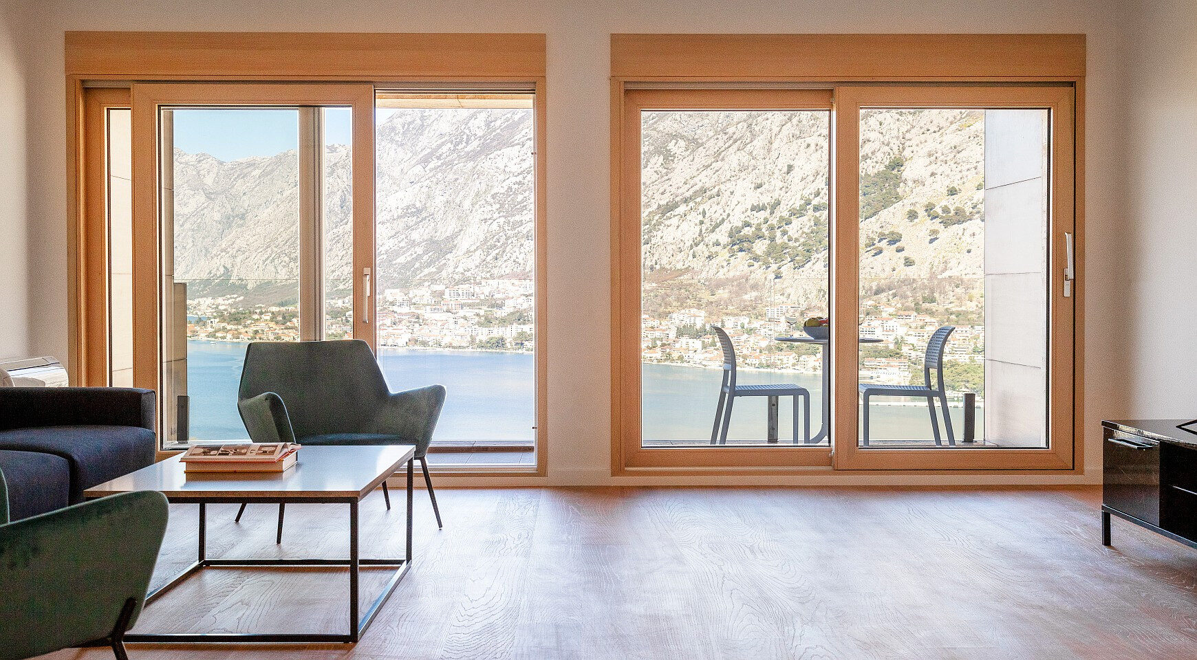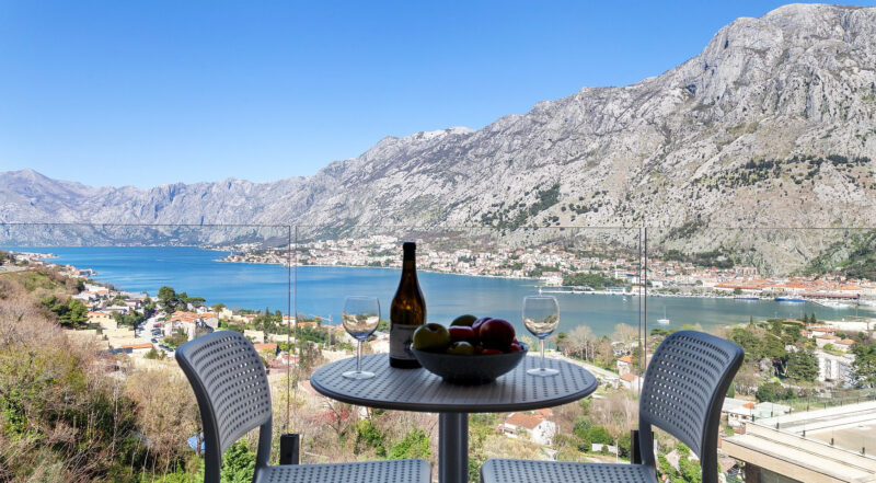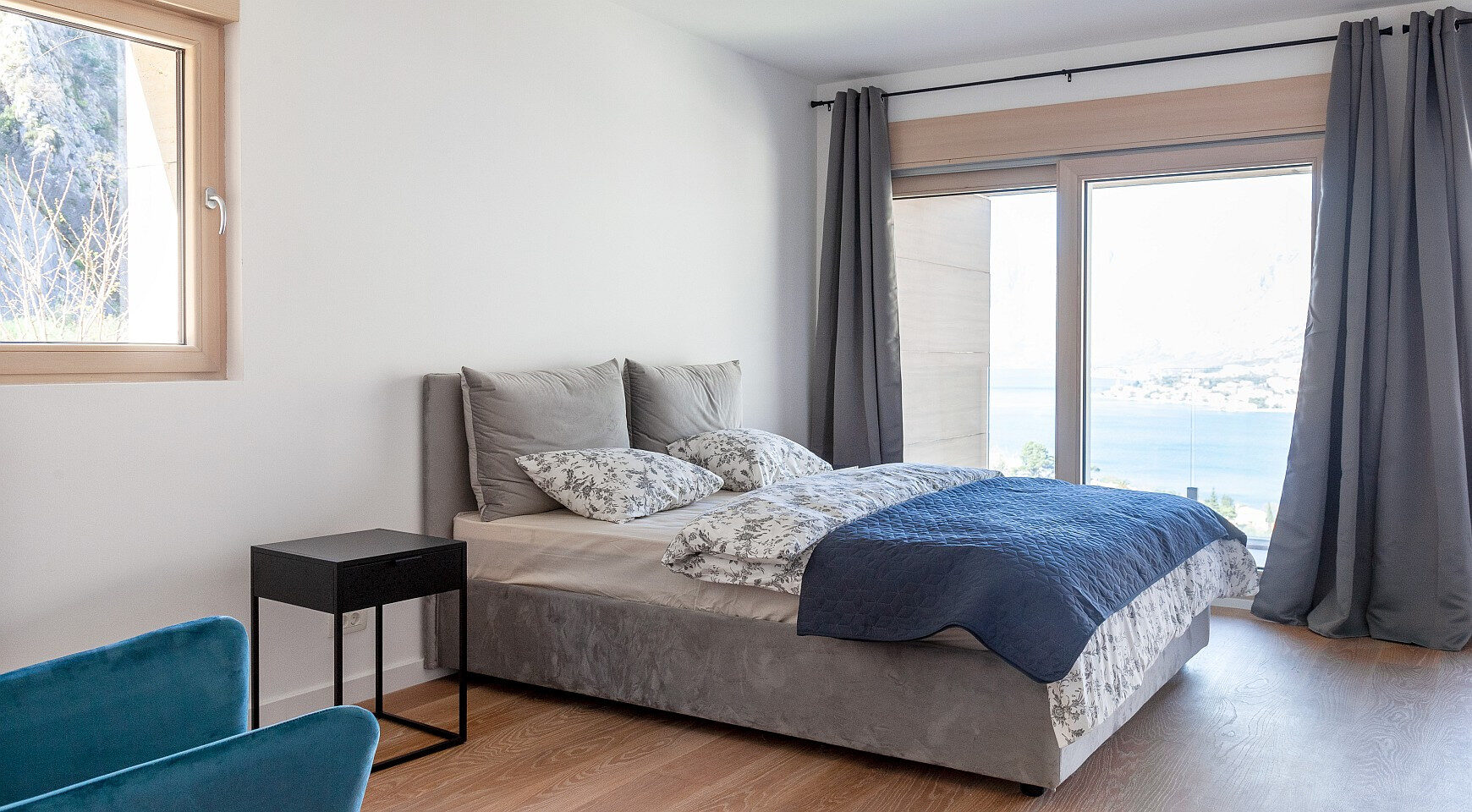 Эта элегантная квартира создана для комфортной жизни большой семьи или для ценителей простора и уединения. Одной из главных особенностей является **неповторимый вид из спален, гостиной и столовой зоны** на лазурные воды Боко-Которской бухты и величественные горные пейзажи.