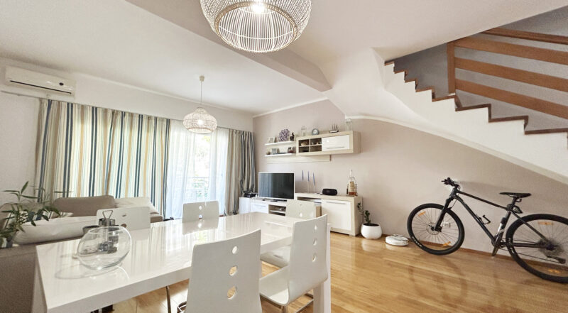 Nudimo na prodaju moderan dvospratni stan sa tri spavaće sobe u kompleksu sa bazenom u Risnu.