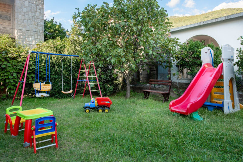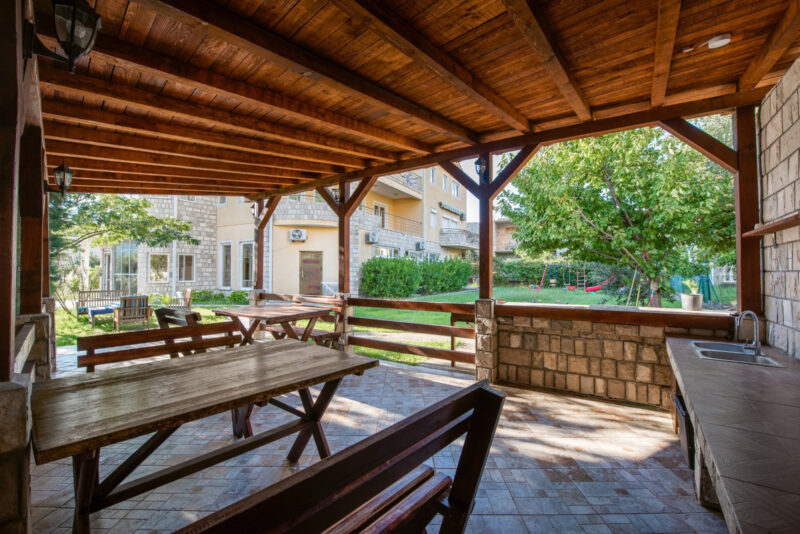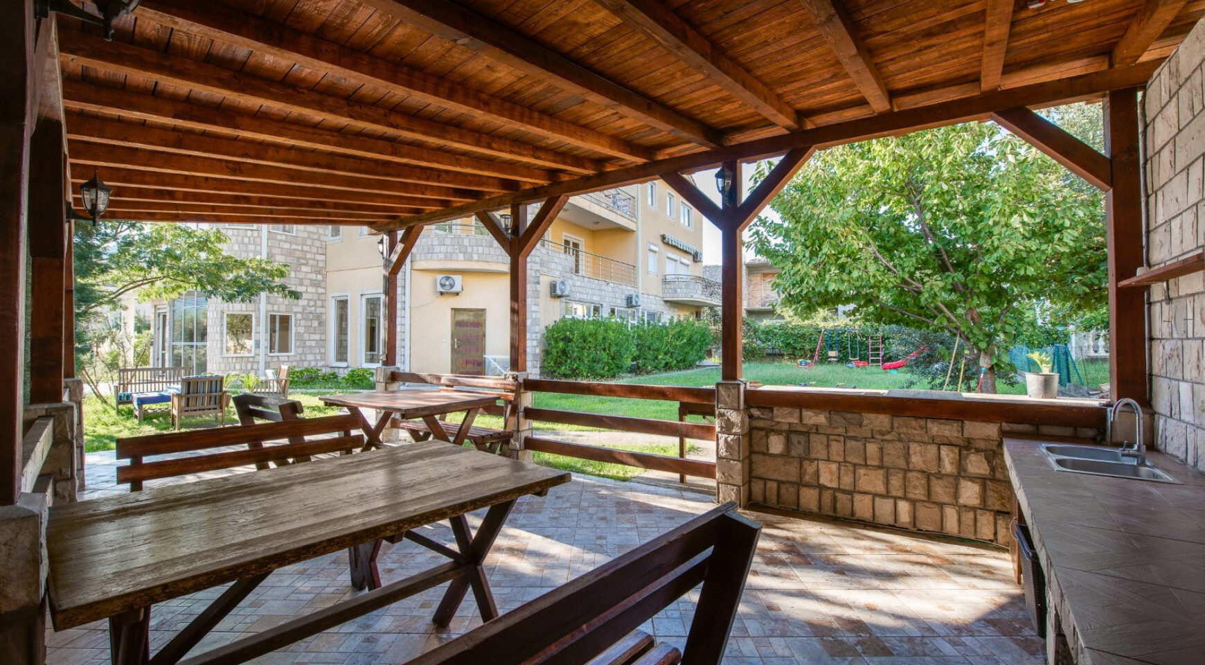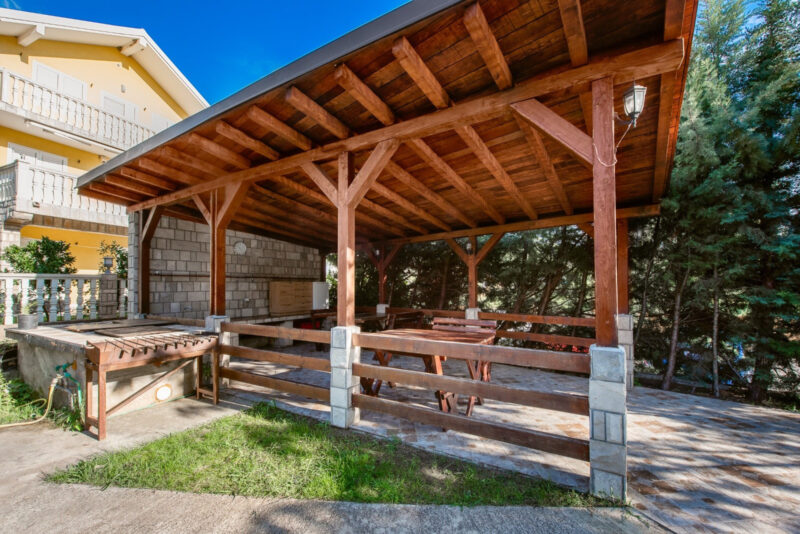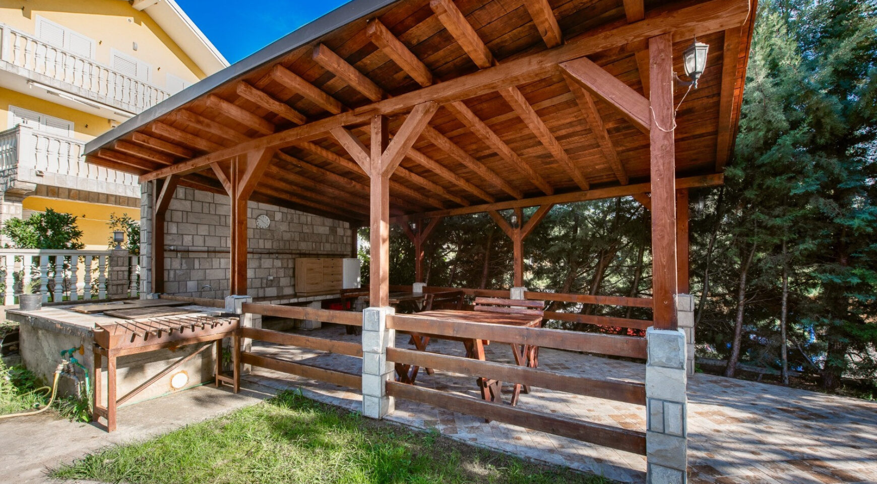 Kuća ima veliki zatvoreni prostor sa parkingom, prostorom za roštilj i velikom paviljonom.
