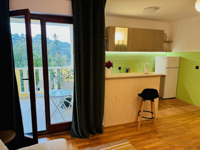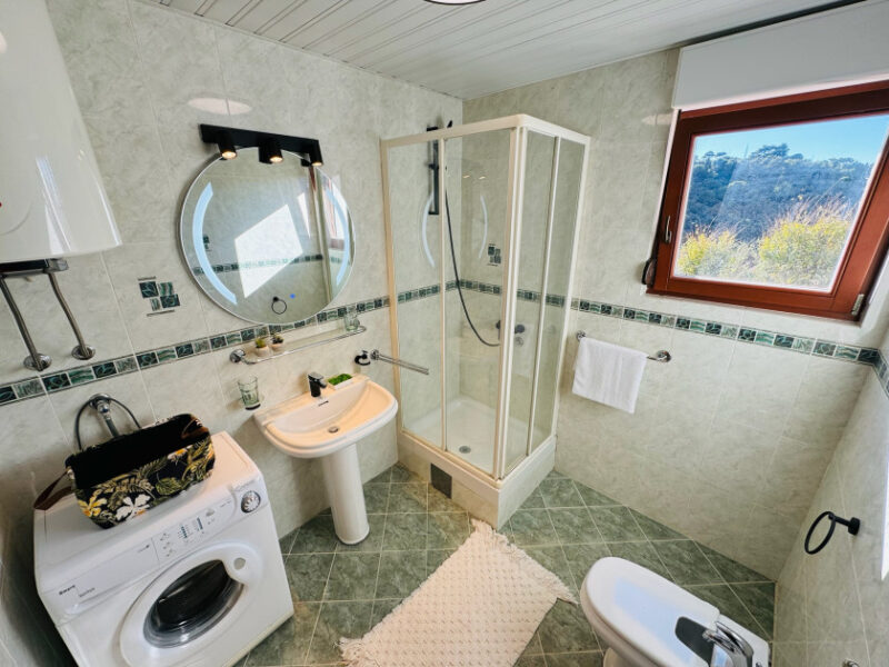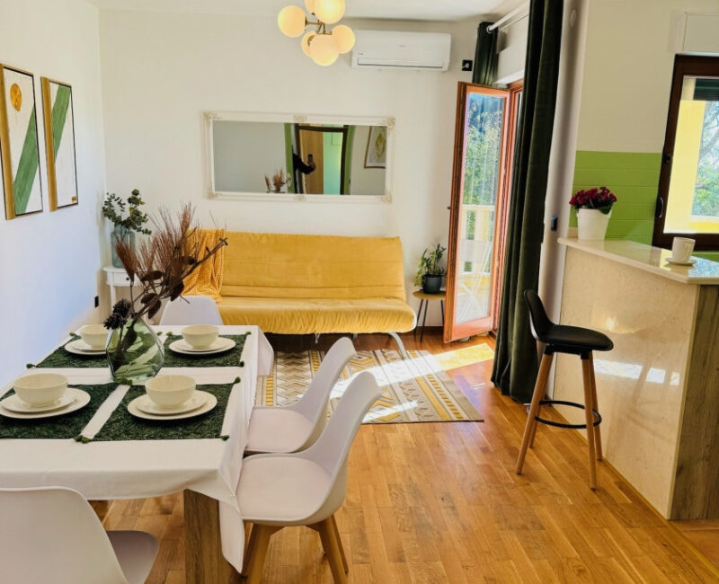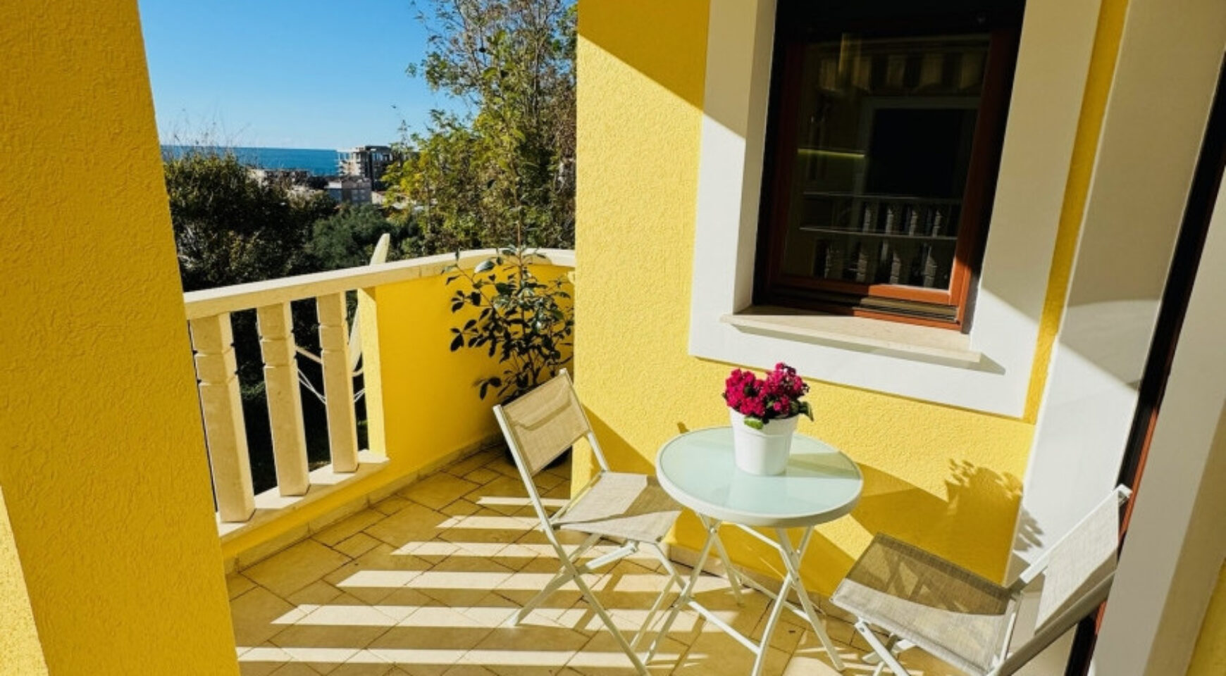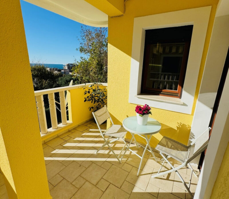 Prvi sprat manje stambene zgrade. Veliki javni parking. 6 minuta hoda do mora.