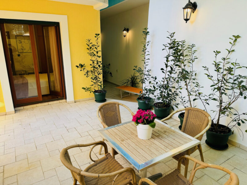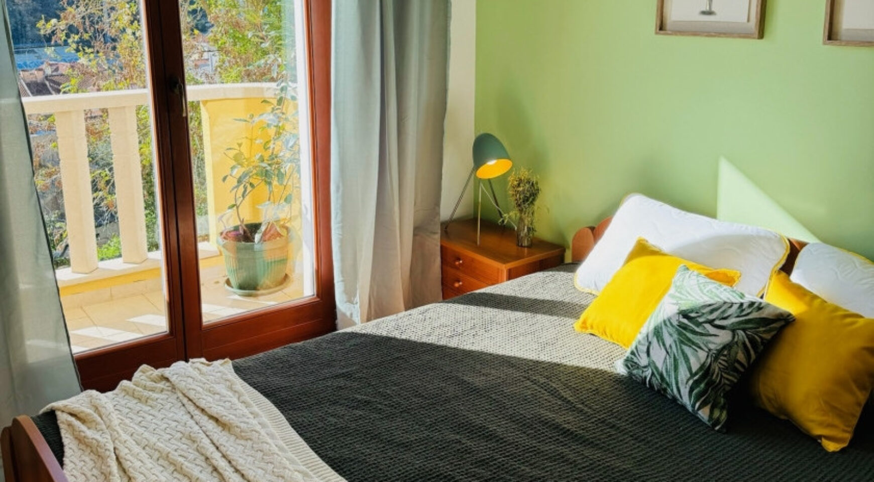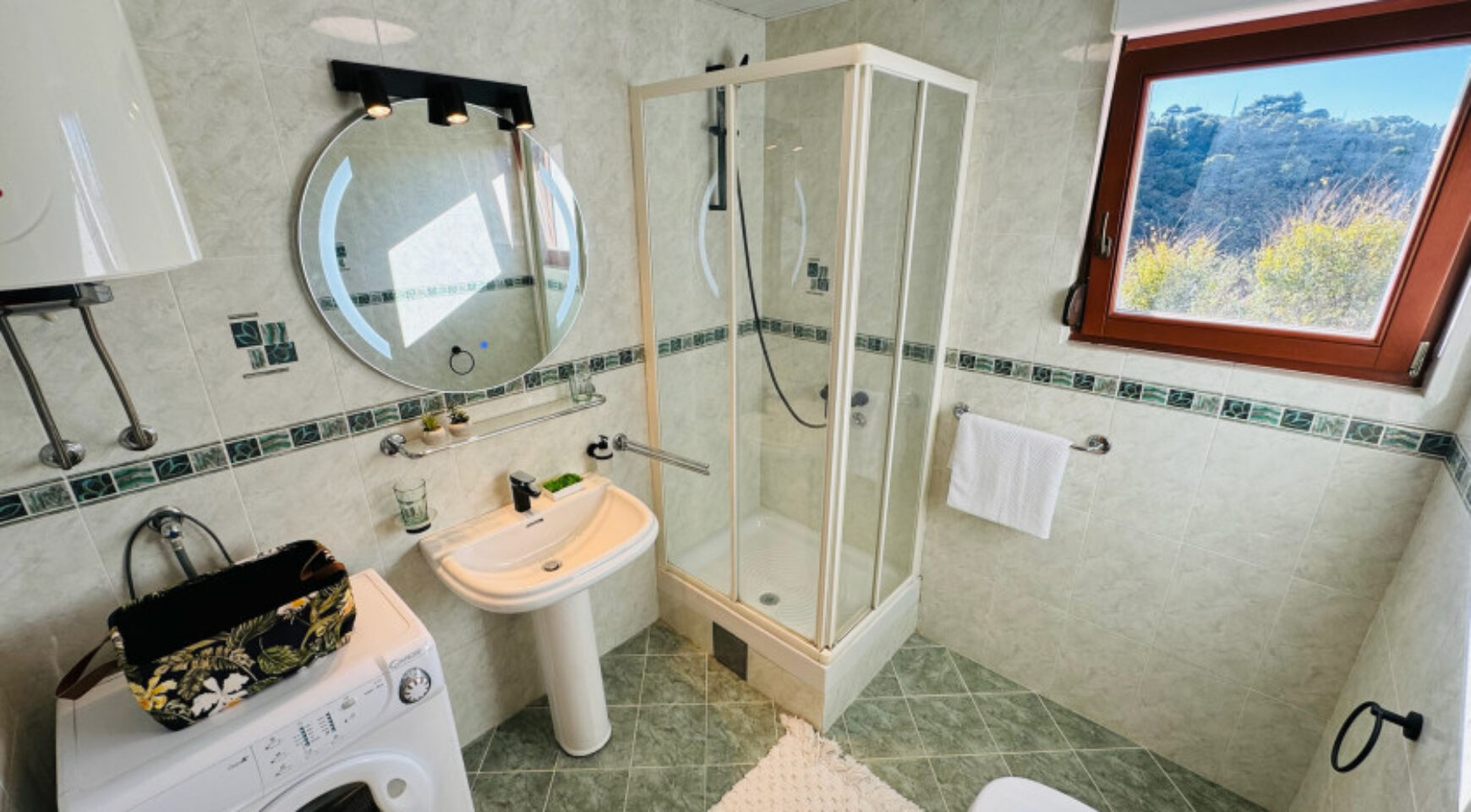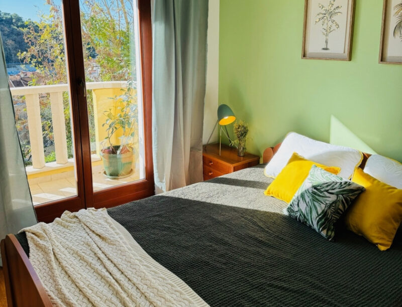 Prvi sprat manje stambene zgrade. Veliki javni parking. 6 minuta hoda do mora.