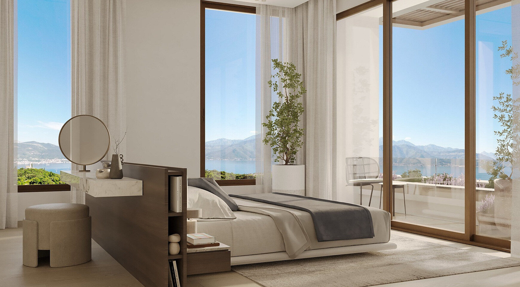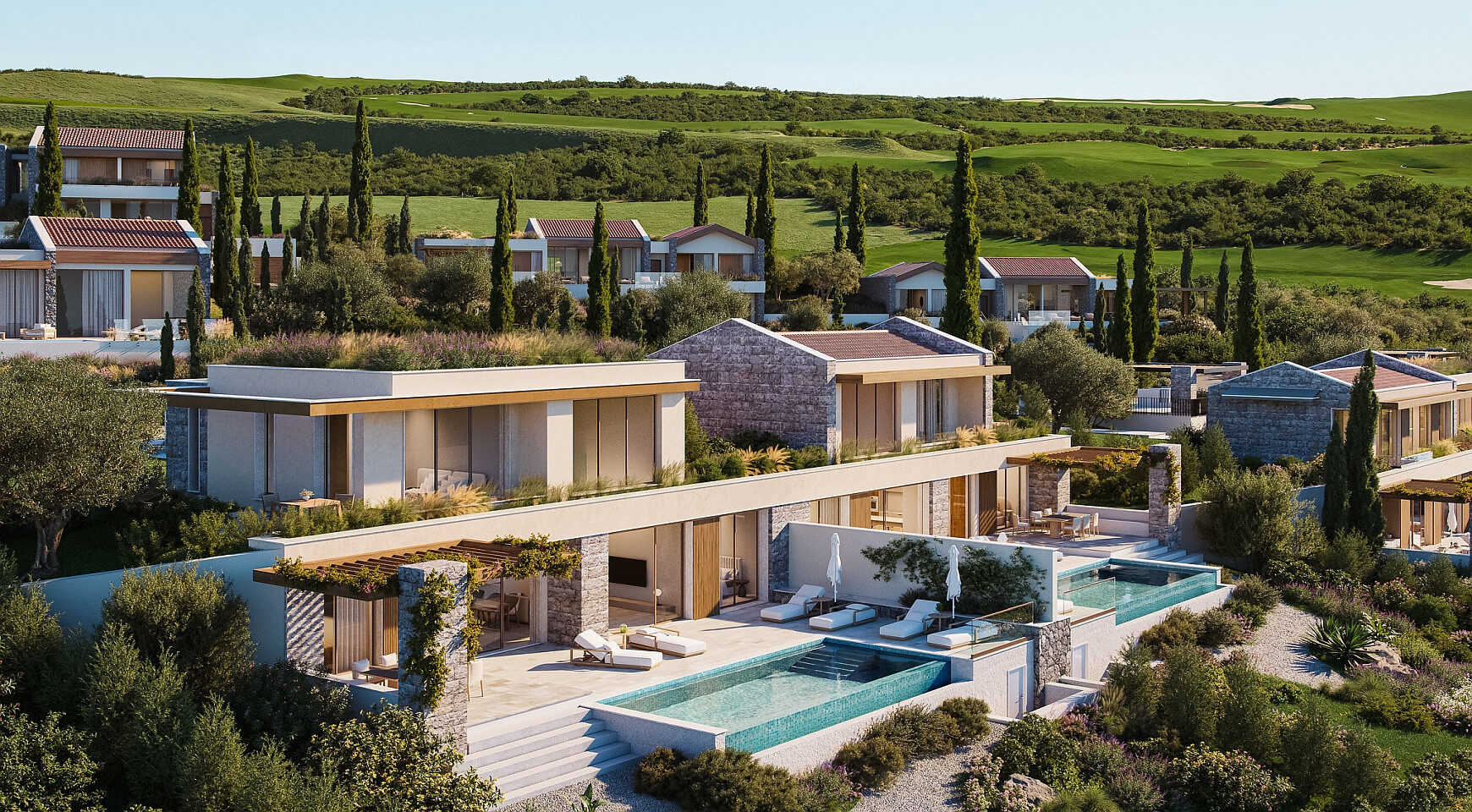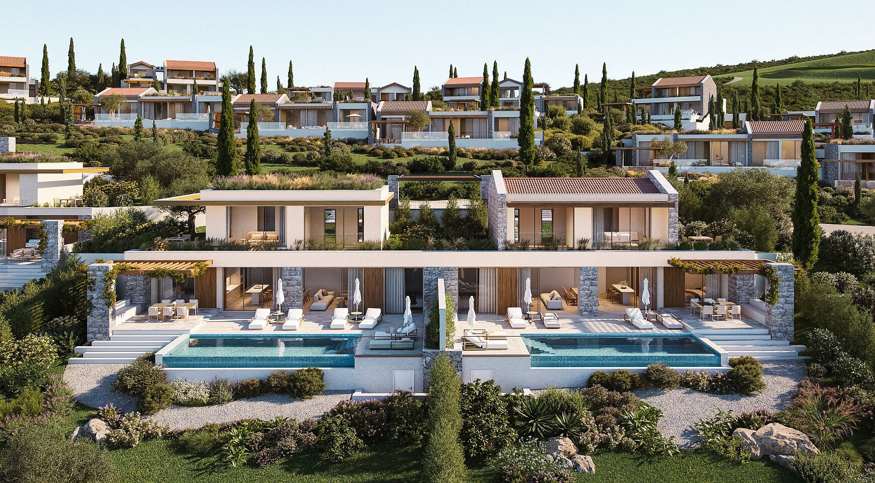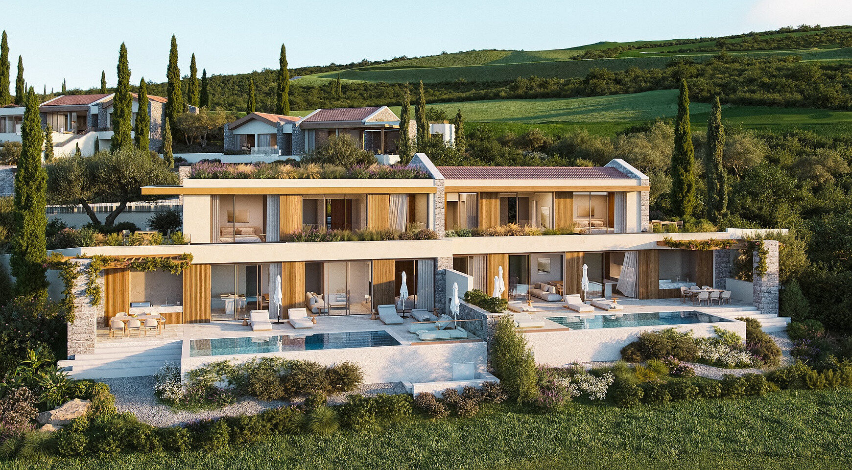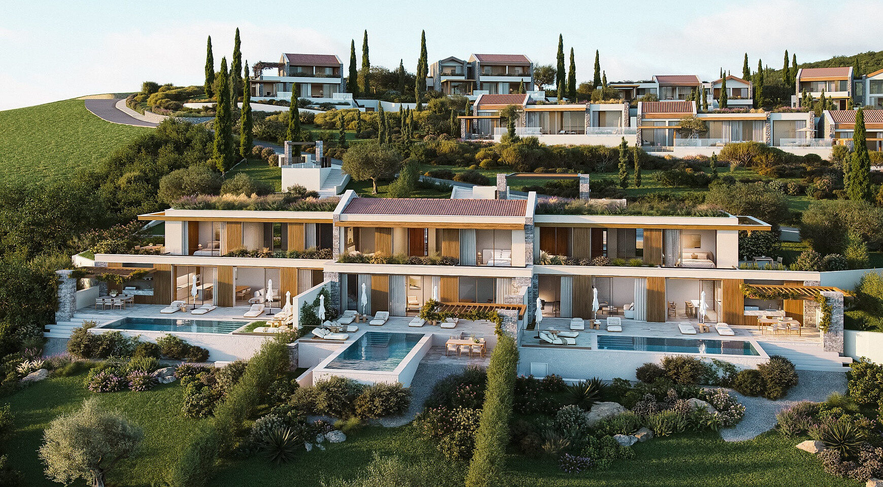 Tri spavaće sobe su pozicionirane tako da pružaju i privatnost i zapanjujući pogled. Glavna spavaća soba ima direktan pristup zelenoj krovnoj terasi od 66 m², gde svakog jutra možete uživati u mirnom odmoru iznad bašte i mora. Napolju se nalazi privatni bazen od 30,6 m² i terase od 75 m², uključujući zasjenjenu pergolu, idealnu za ručavanje na otvorenom. Letnja kuhinja se može nadograditi kako bi se stvorio mediteranski prostor za život tokom cele godine.