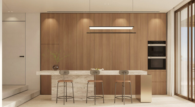 Nolte kuhinja (ili sličan premium međunarodni brend) sa aparatima Miele je jednostavna i elegantna. Završna obrada u celoj kući odražava mediteranski pejzaž: prirodni kamen, visokokvalitetne keramičke pločice i meki, zemljani tonovi. Sva kupatila imaju podno grejanje, dok sistem klimatizacije zaštićen od vetra obezbeđuje udobnost tokom cele godine.