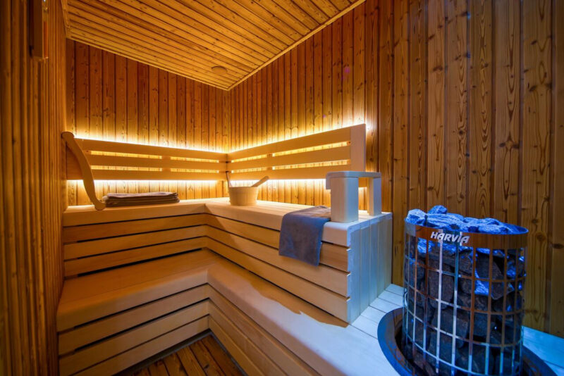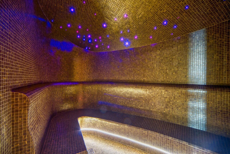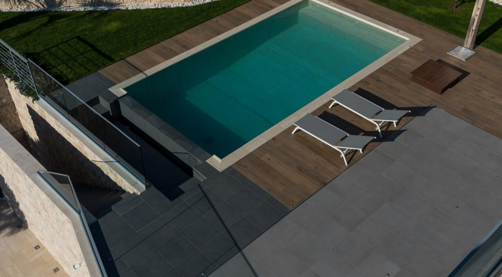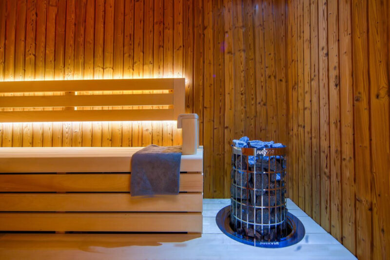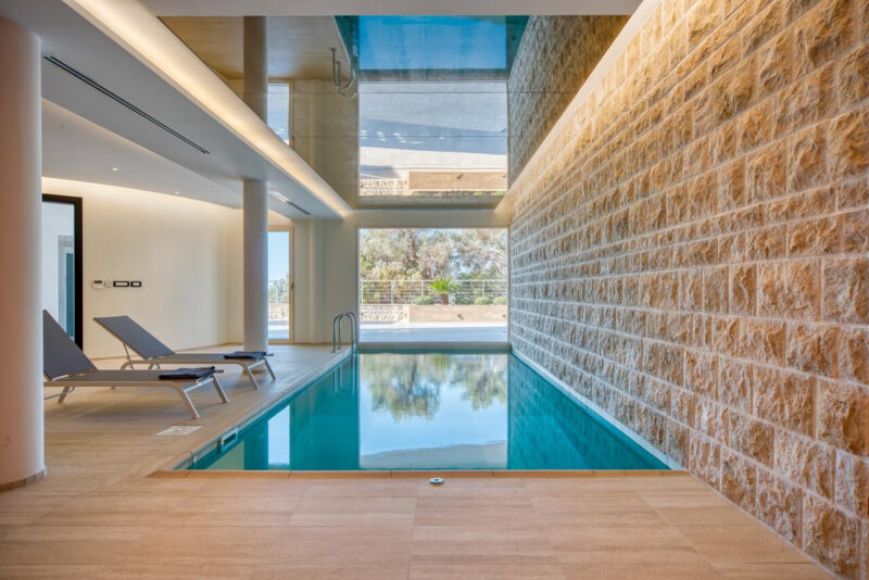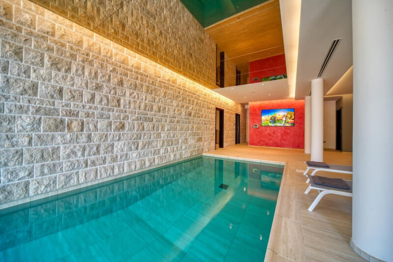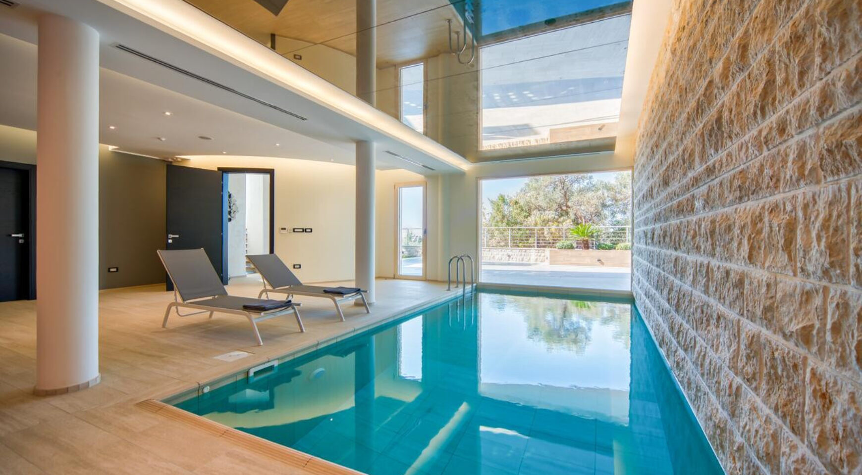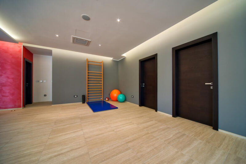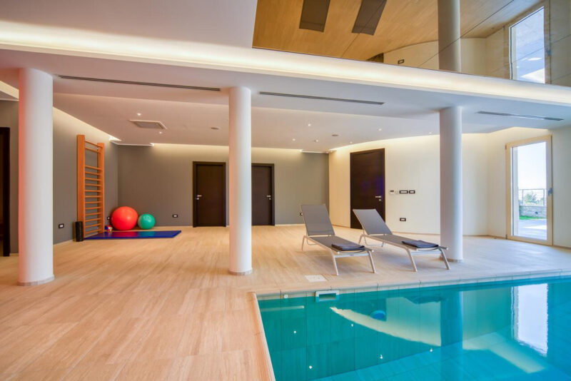 Prizemlje je posvećeno kompletnom velnes i spa kompleksu: zatvoreni bazen, prostor za opuštanje, kupatilo, soba za masažu, studio, prostorije za osoblje, parno kupatilo i prostrana terasa od 167 m².
