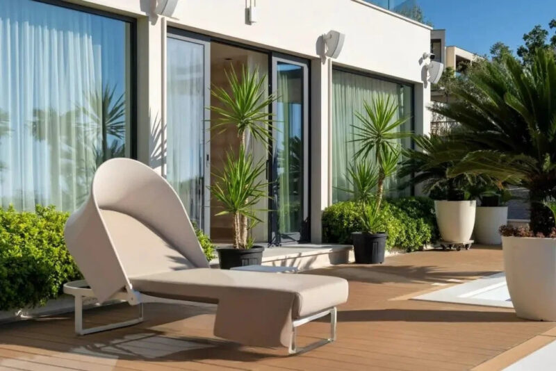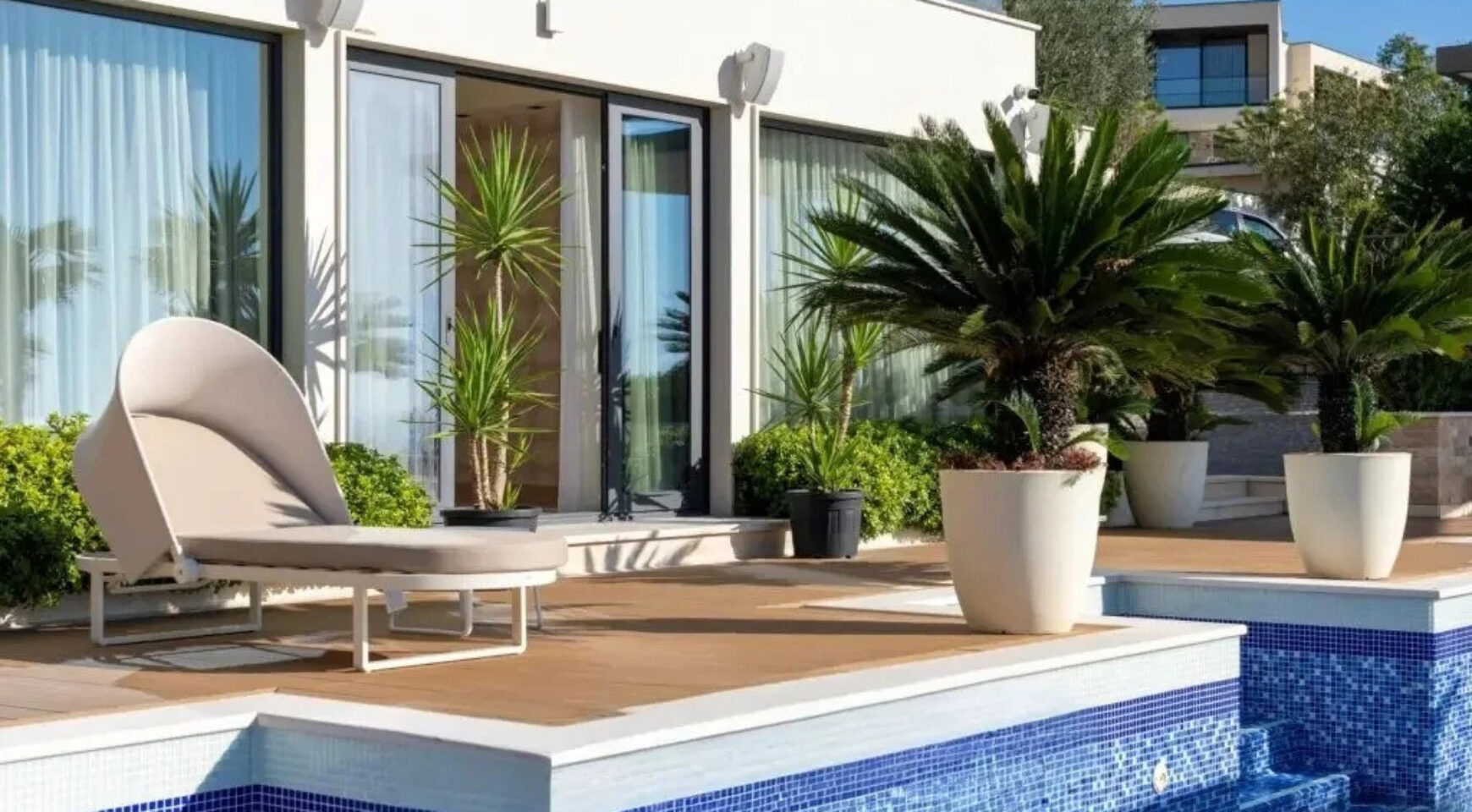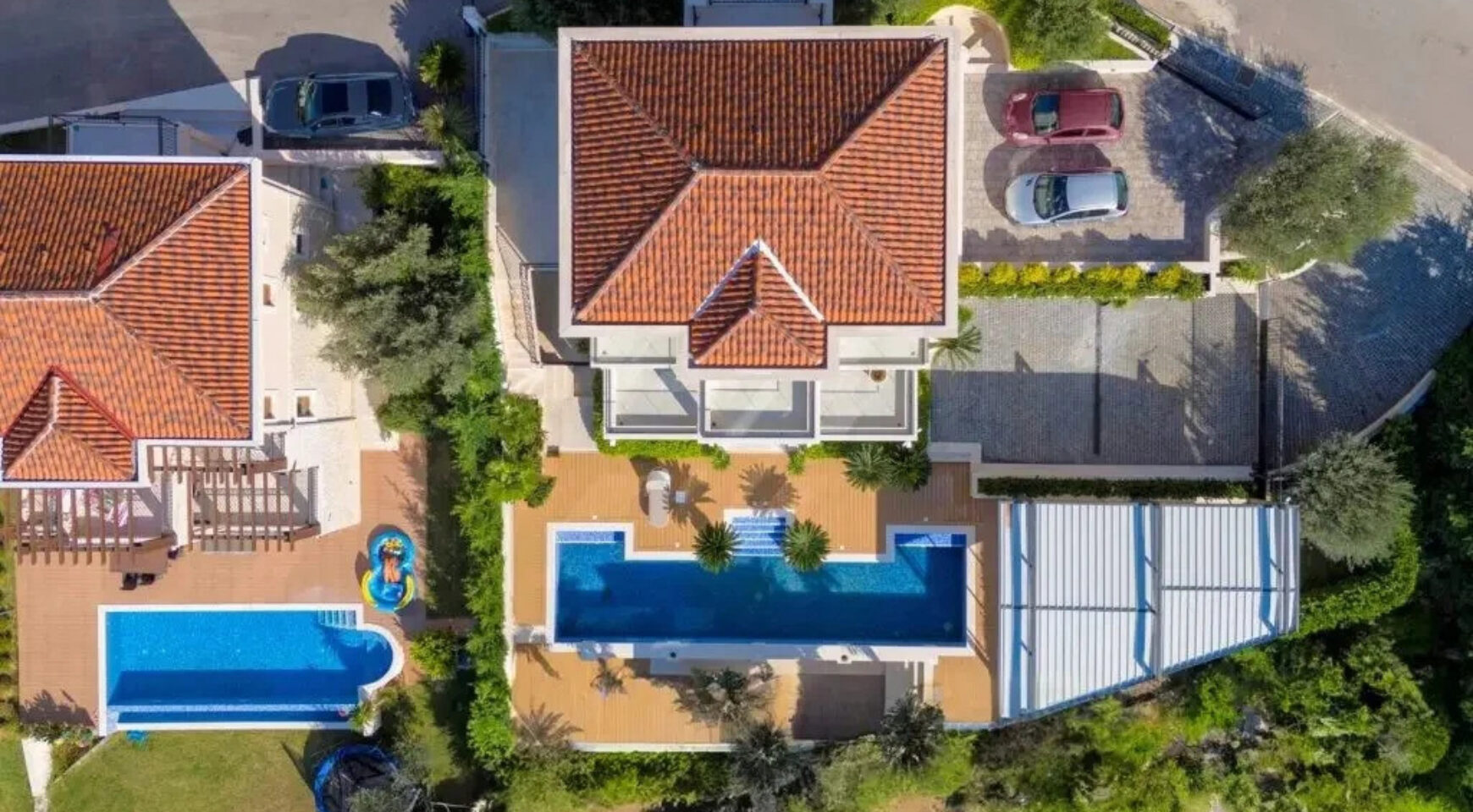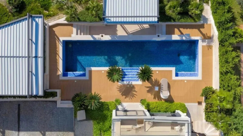 Ispred kuće nalazi se bazen dimenzija 15 x 4 m, okružen terasom i dekorativnim uređenjem. Ispod bazena nalazi se udoban dnevni boravak sa barom.