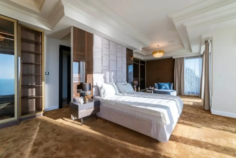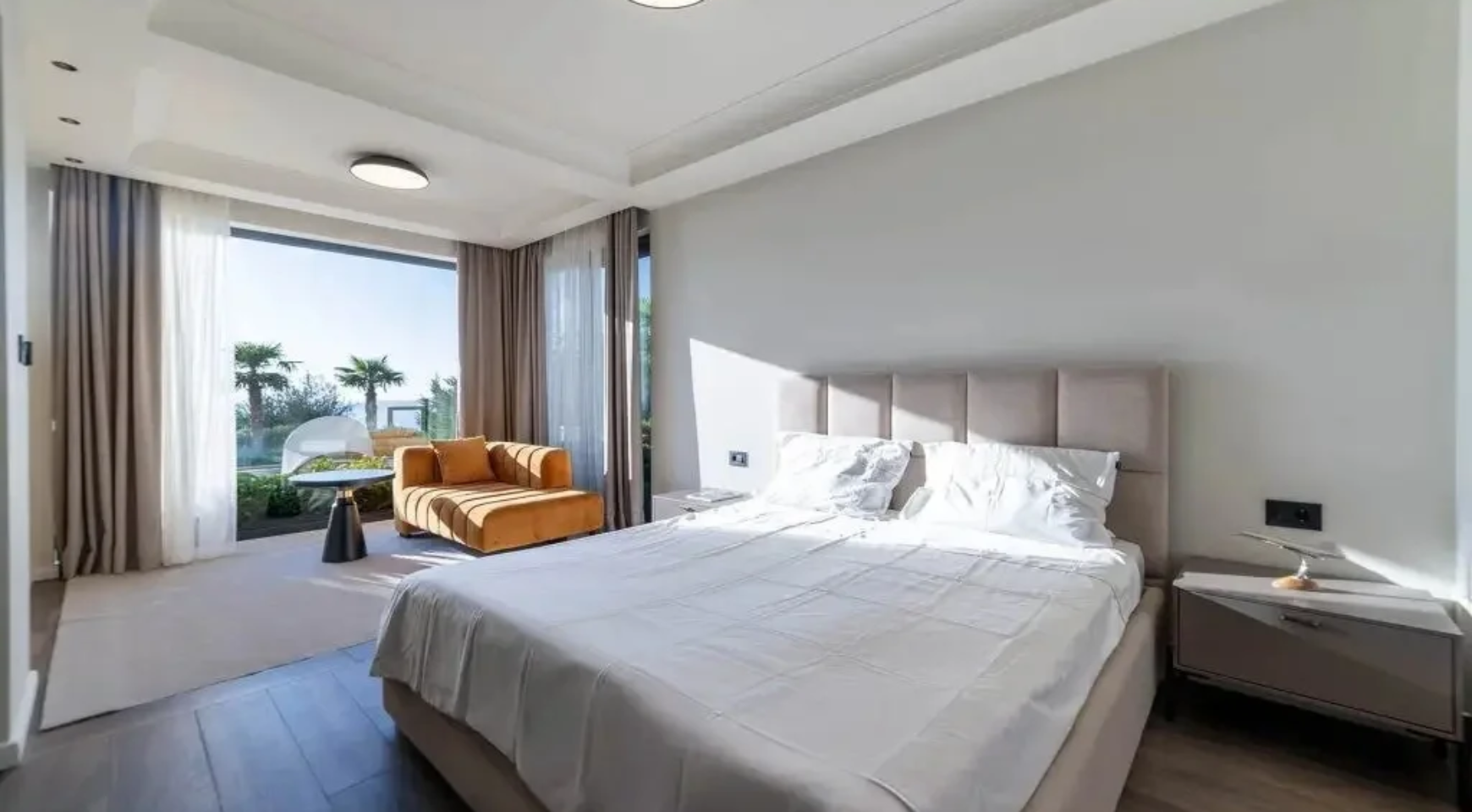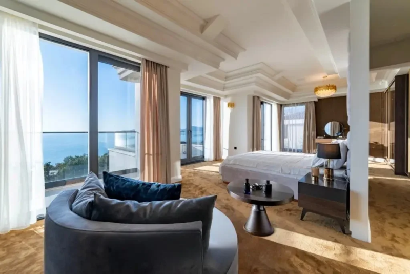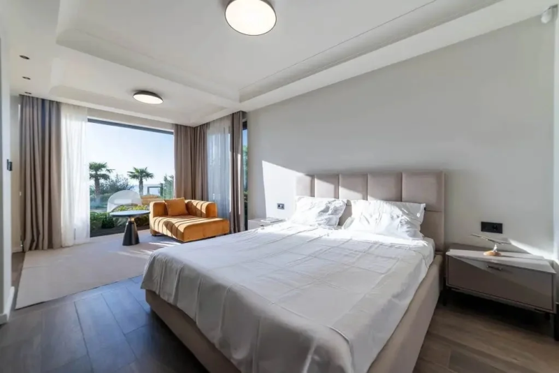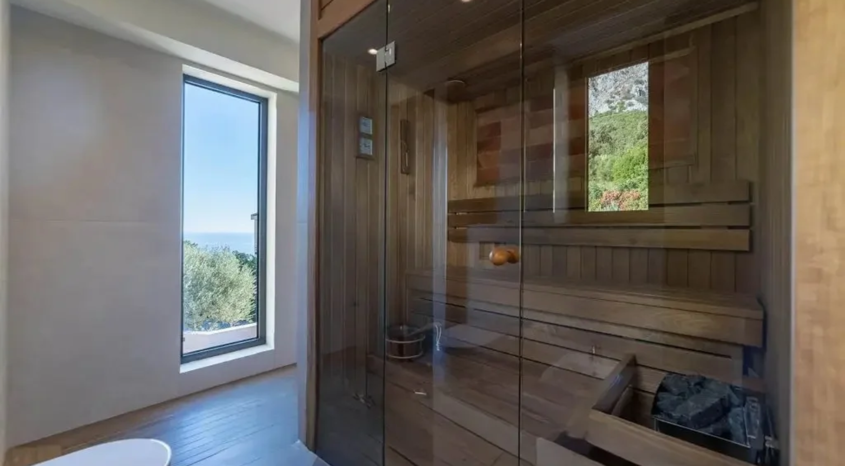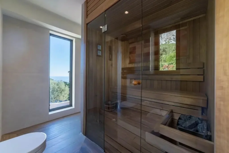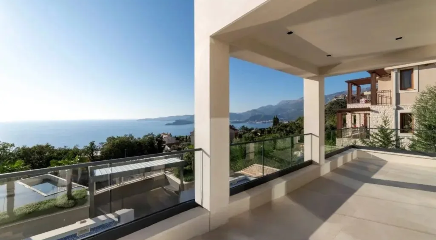 Gornji sprat sadrži glavnu spavaću sobu sa sopstvenim kupatilom, saunu i četiri terase sa pogledom na more i planinski pejzaž.