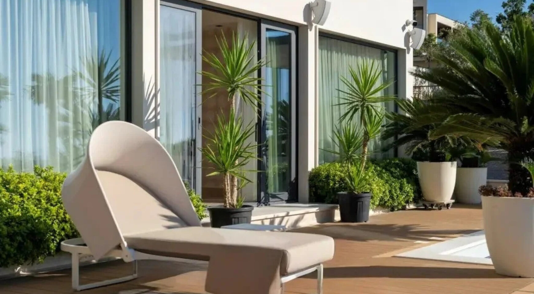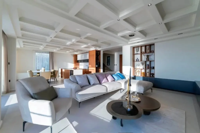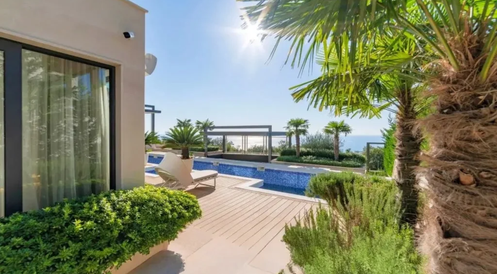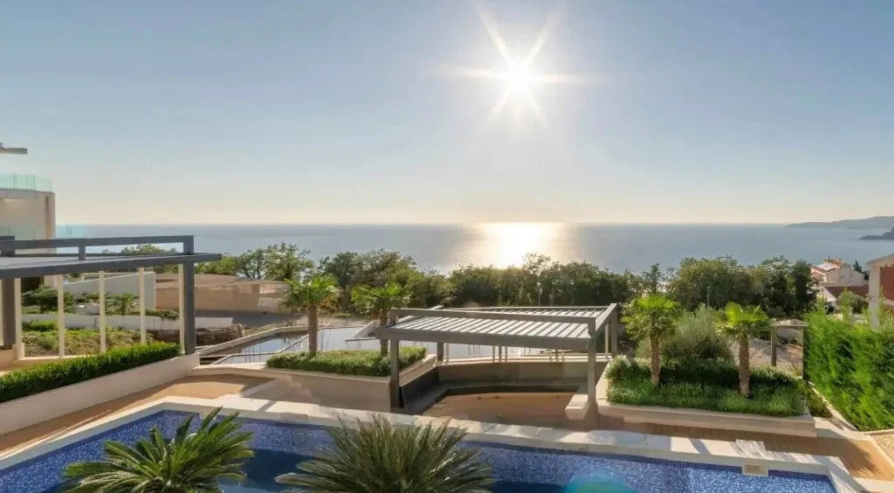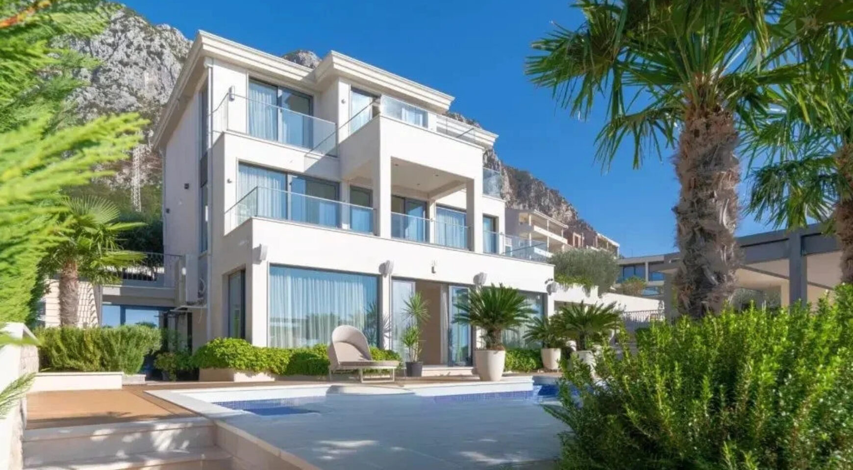 Gornji sprat sadrži glavnu spavaću sobu sa sopstvenim kupatilom, saunu i četiri terase sa pogledom na more i planinski pejzaž.