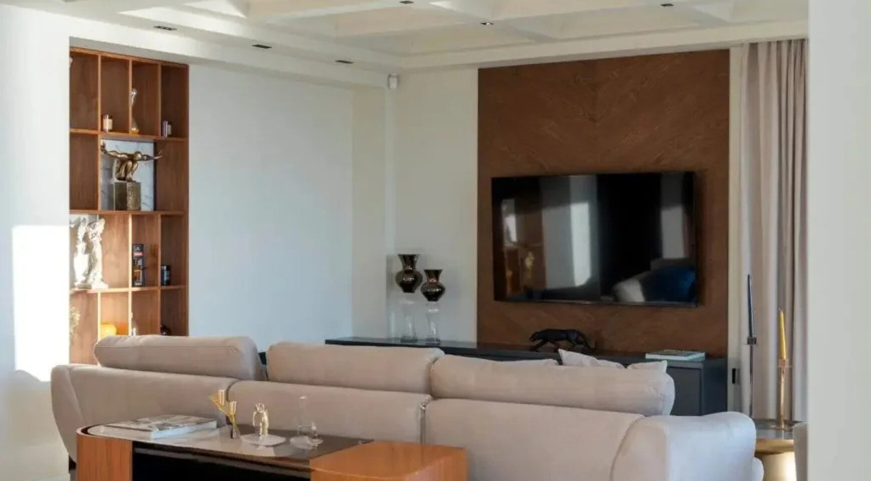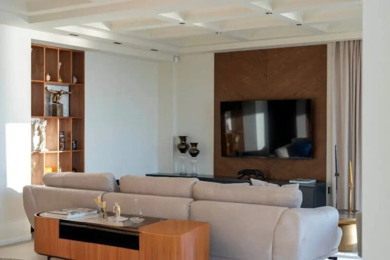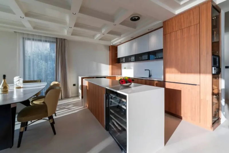 Donji nivo sadrži dve spavaće sobe sa sopstvenim kupatilima i panoramskim zastakljenjem, koje nude direktan pristup bazenu i uređenoj bašti. Ovde se nalaze i vinski podrum i veza sa garažom.