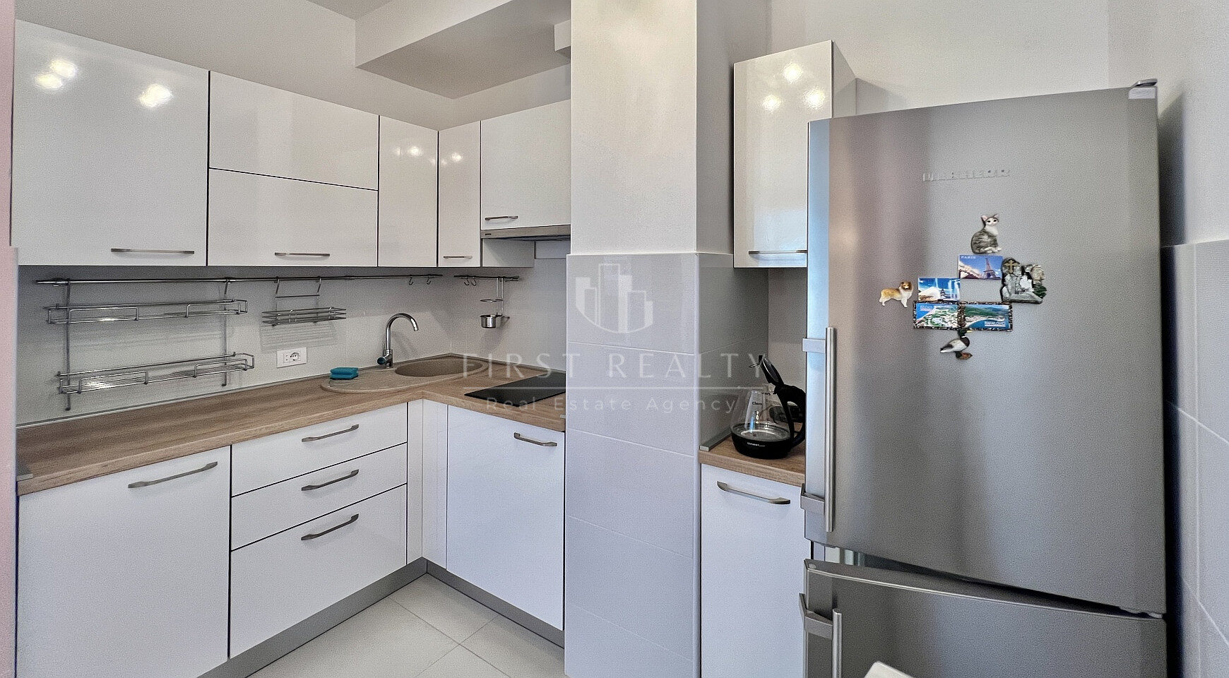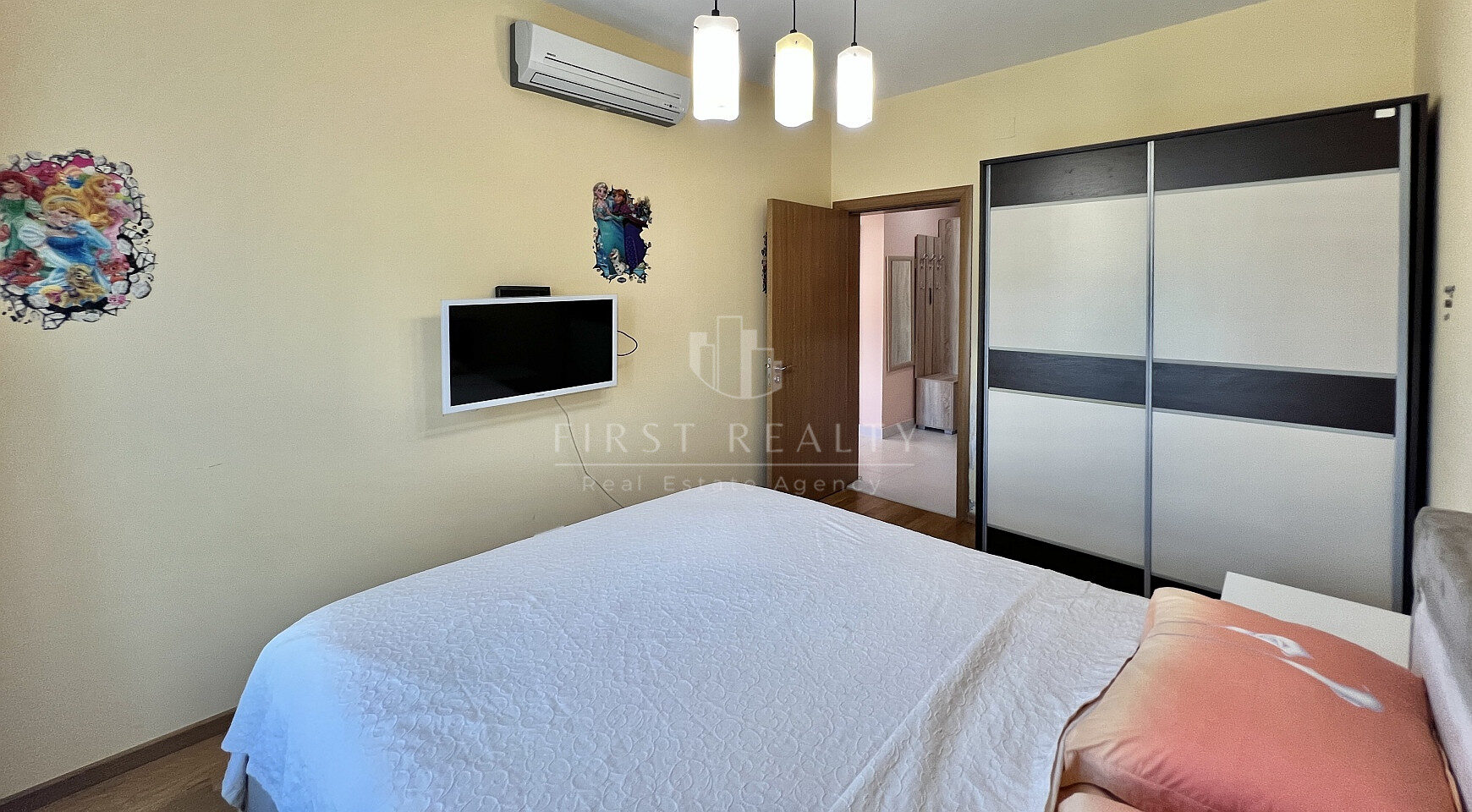 Stan sadrži: prostrani dnevni boravak sa modernom kuhinjom, trpezarijom, dve spavaće sobe, veliko kupatilo sa kadom i bideom, prostranu terasu sa pogledom na more. Sve dnevne sobe imaju parket. Sistem toplog poda u kupatilu.