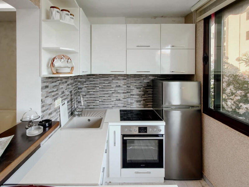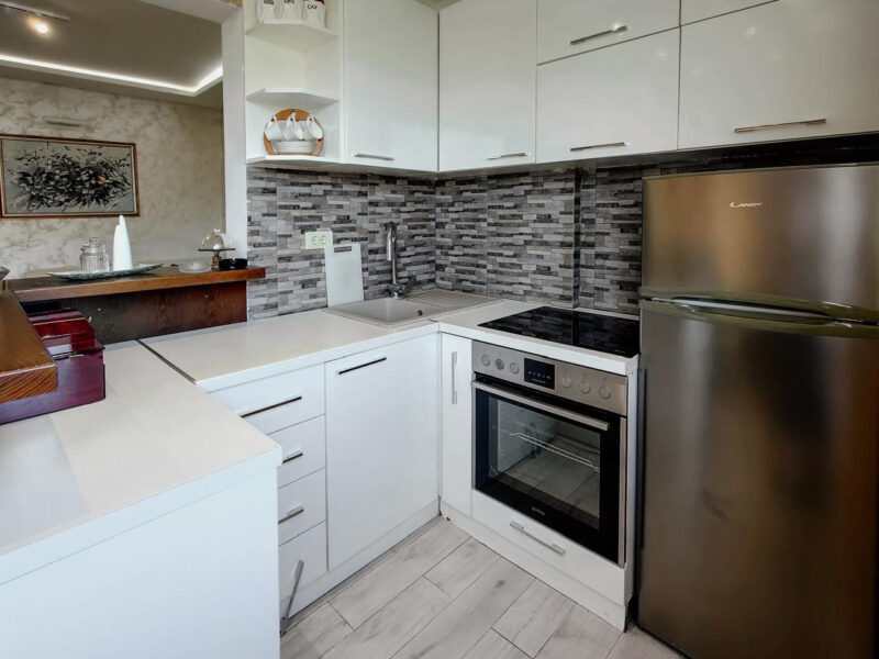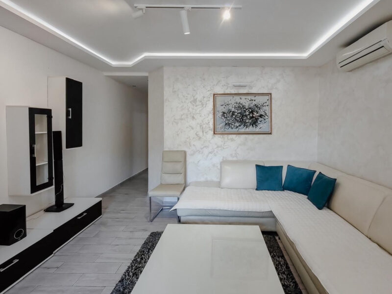 Dupleks stan u luksuznoj zgradi sa odličnim pogledom na more i planine. Kompletno namešten, nemački kuhinjski nameštaj, ugradni Bosh aparati, split sistemi u svakoj prostoriji, kamin. Dve spavaće sobe, dva VC-a, kuhinja, trpezarija, dnevni boravak, đakuzi. Na ulazu je lift, mermerno stepenište. Do mora 500 m ili 10 minuta pješice. Kao bonus, tu je parking mesto u natkrivenoj garaži.
